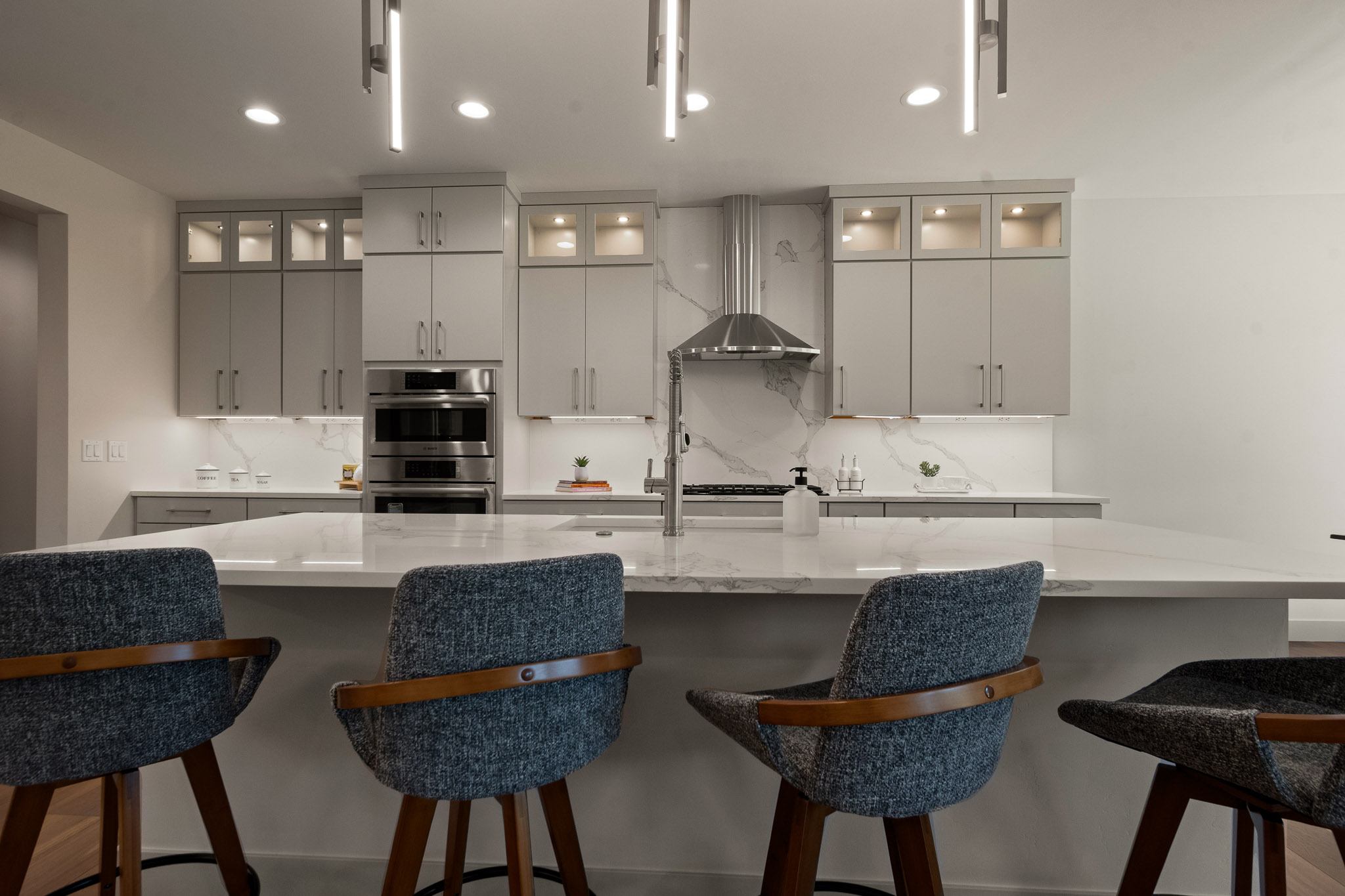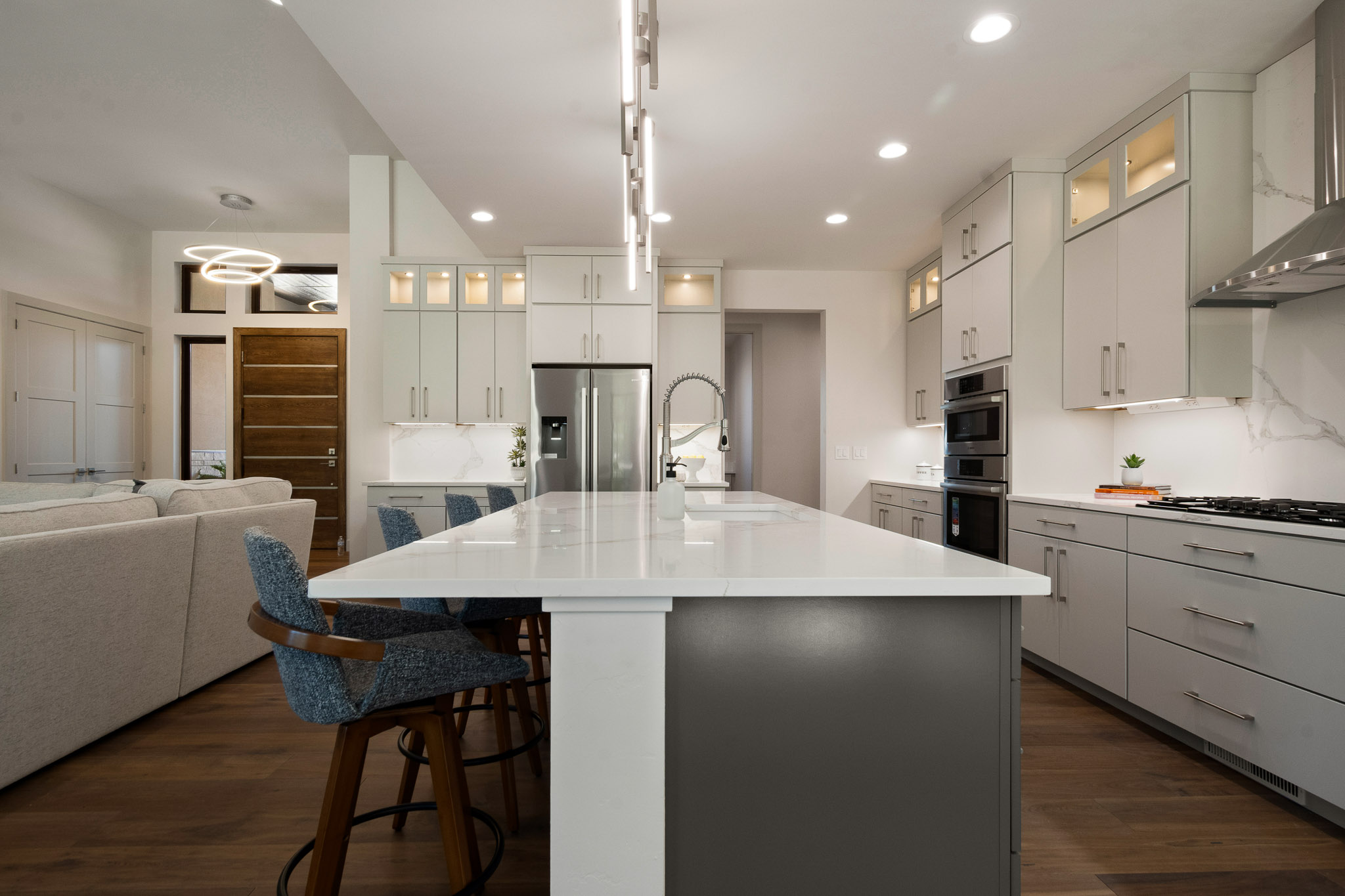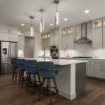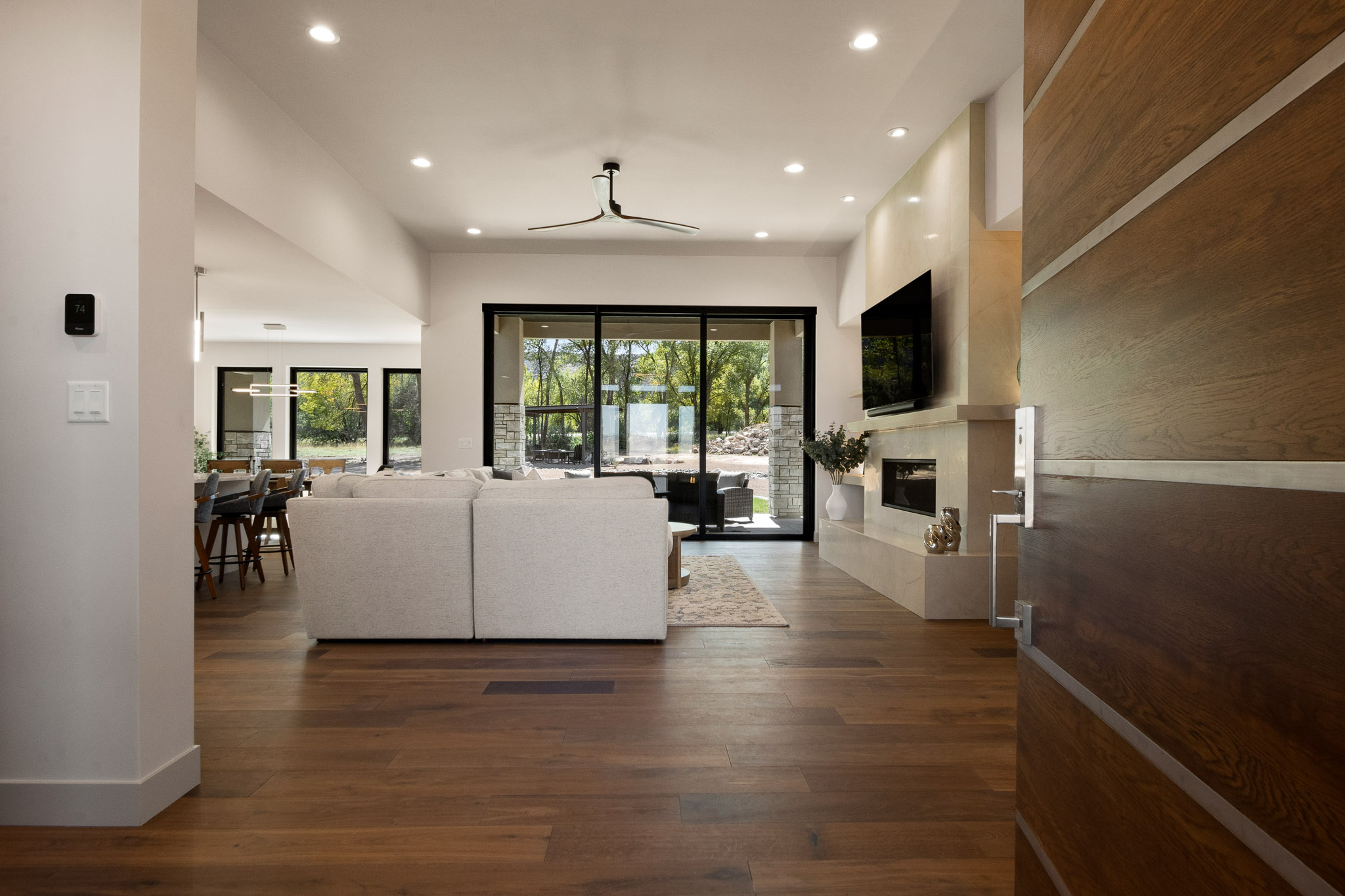 This custom home design reflects a balance between proven planning and personalized details. Clean, modern forms are softened by organic textures and finishes, resulting in a space that feels warm, intentional, and timeless.